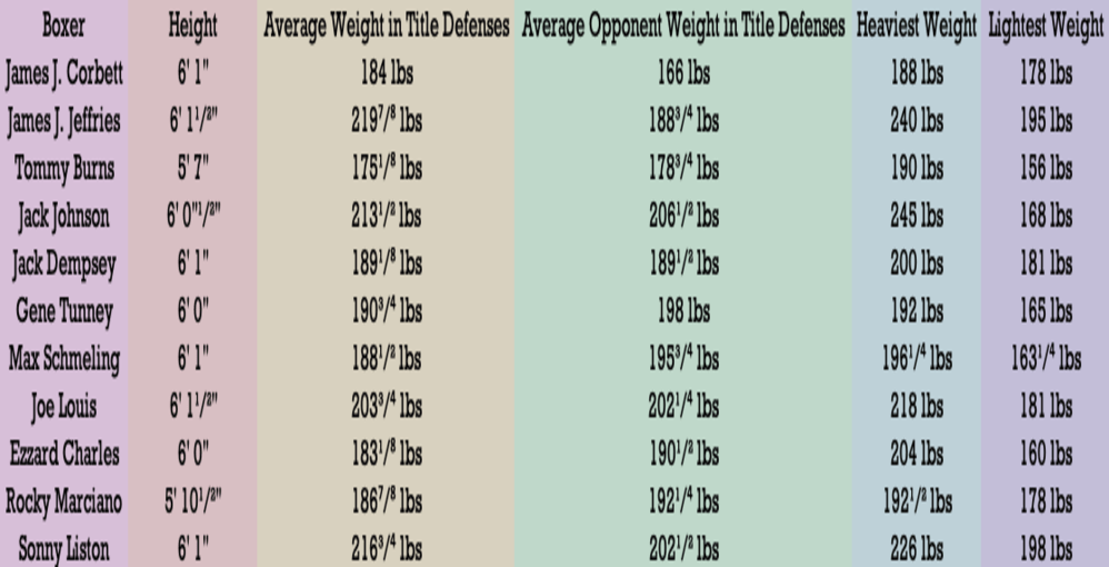 I’ve rounded the weights to the nearest eighth pound. Not all data is complete due to certain fights taking place so long ago.